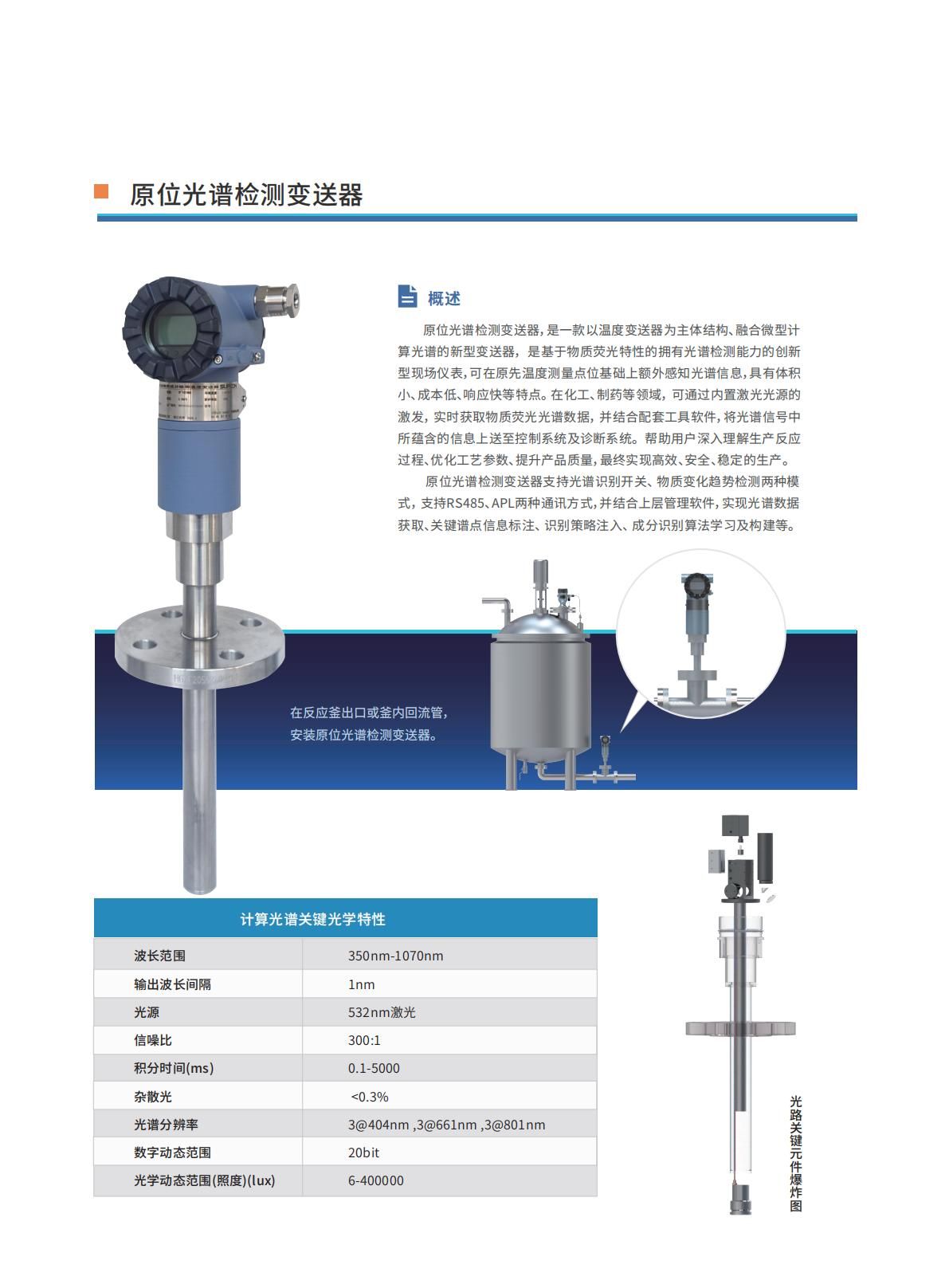原位光譜檢測變送器,是一款以溫度變送器為主體結構、融合微型計算光譜的新型變送器, 是基于物質熒光特性的擁有光譜檢測能力的創新型現場儀表,可在原先溫度測量點位基礎上額外感知光譜信息,具有體積小、成本低、響應快等特點。 在化工、制藥等領域, 可通過內置激光光源的激發, 實時獲取物質熒光光譜數據, 并結合配套工具軟件,將光譜信號中所蘊含的信息上送至控制系統及診斷系統。 幫助用戶深入理解生產反應過程、優化工藝參數、提升產品質量,最終實現高效、安全、穩定的生產。原位光譜檢測變送器支持光譜識別開關、 物質變化趨勢檢測兩種模式, 支持RS485、APL兩種通訊方式,并結合上層管理軟件,實現光譜數據獲取、關鍵譜點信息標注、 識別策略注入、 成分識別算法學習及構建等。